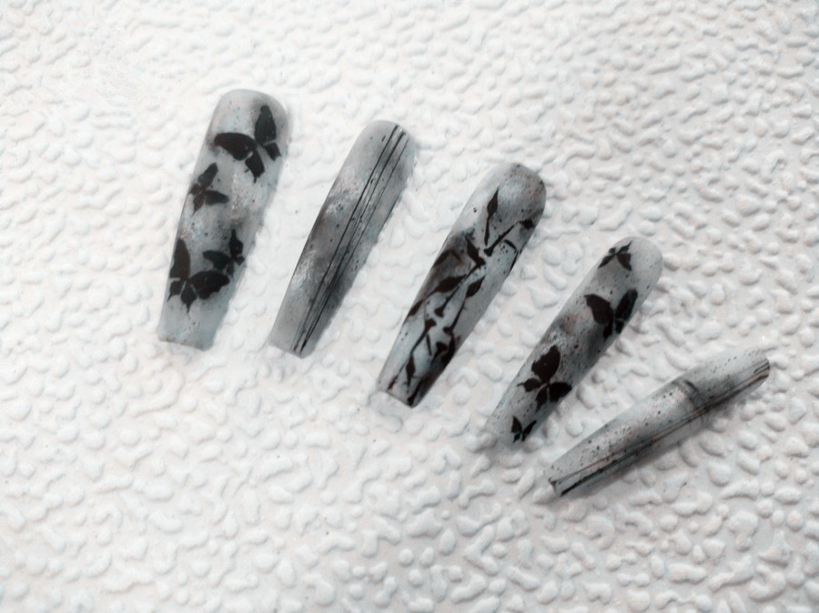 使用乳白色彩繪膠打底,蘸取黑色甲油膠在甲面上隨意鋪展開,然后在慢慢進行自然過渡的暈染,打造色彩在水面暈開的感覺。之后在用彩繪筆畫出黑色蝴蝶圖案及其他點綴圖案,蕞后涂上磨砂封層,使得整副作品的圖案更加逼真,蝴蝶仿馬上就要翩翩起舞,看起來很有靈氣。同時也將經(jīng)典的文雅氣韻躍于“指”上。