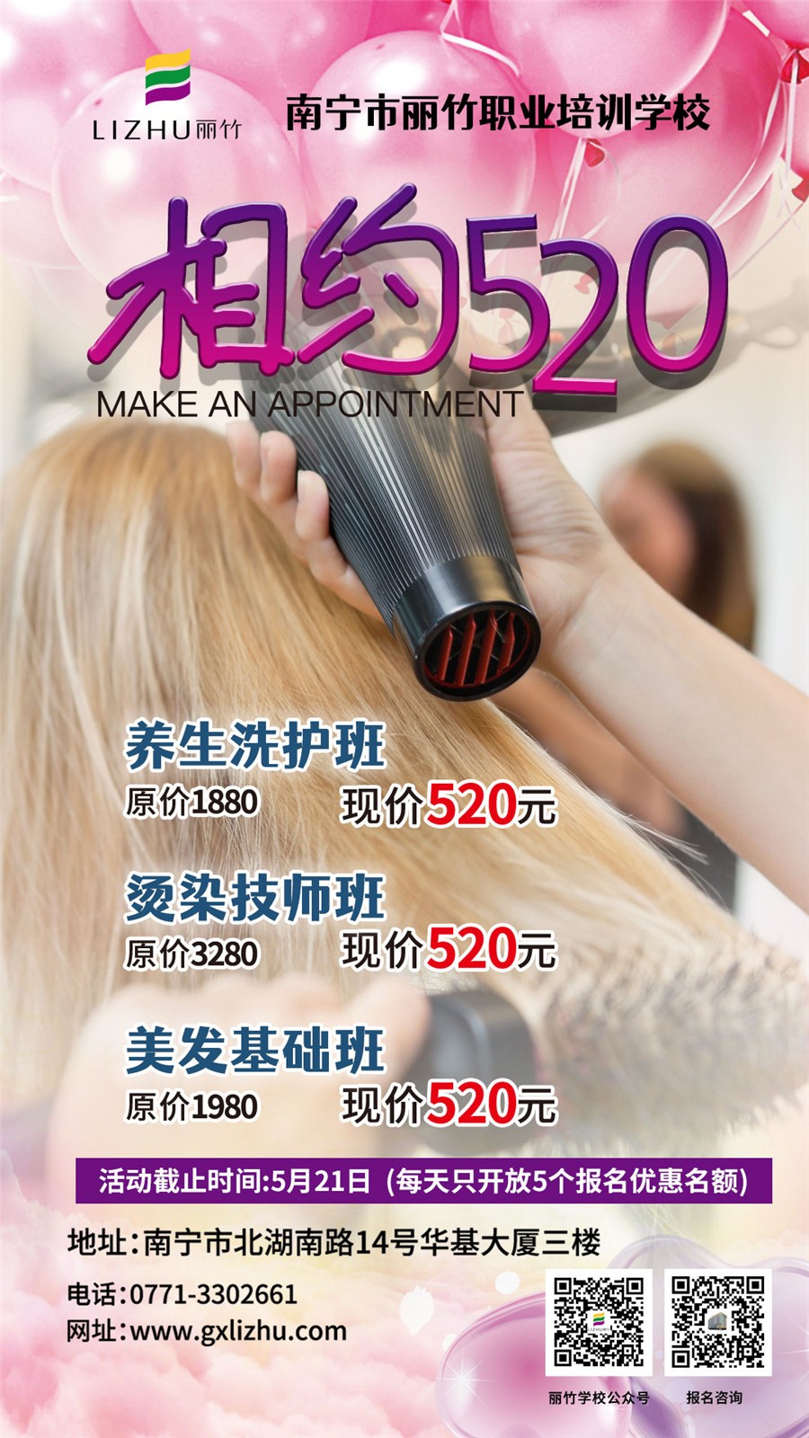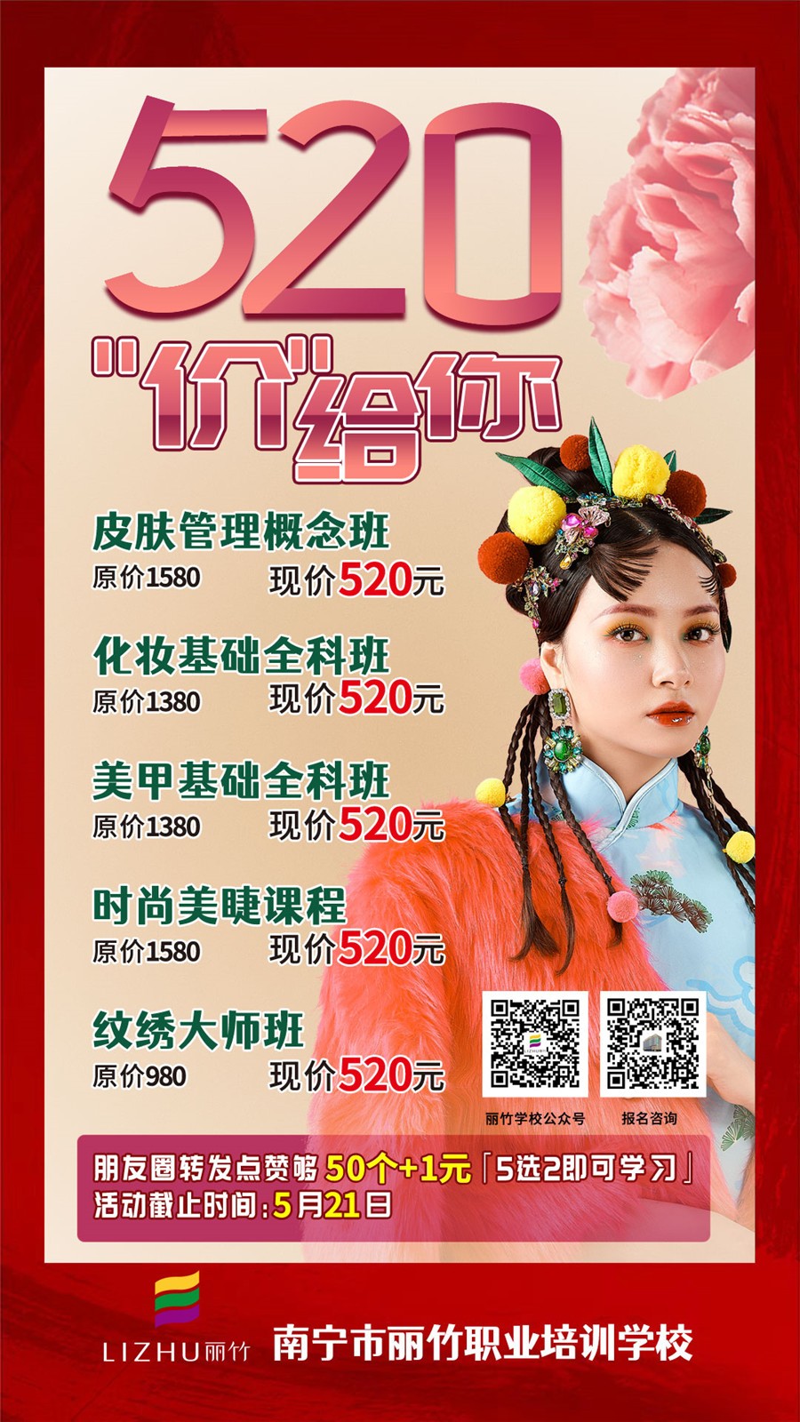 麗竹學(xué)?!?20告白季”重磅推出5大“美麗護(hù)膚系列”課程,原價(jià)值3160元的培訓(xùn)項(xiàng)目,轉(zhuǎn)發(fā)朋友圈點(diǎn)贊集50個(gè) + 截圖保存,只需520+1元,即可從5門(mén)課程選2門(mén)學(xué)習(xí)?;顒?dòng)時(shí)間為:5月20日當(dāng)天報(bào)名的29個(gè)名額