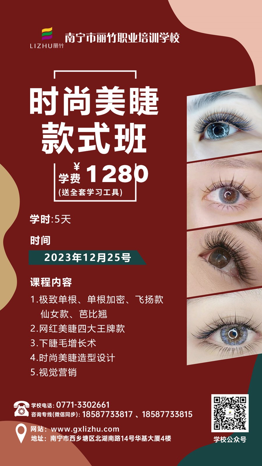 南寧美睫師、零基礎(chǔ)美睫教學(xué):如果你想在南寧學(xué)美睫,想知道南寧美睫培訓(xùn)班哪家好?那么千萬(wàn)不要錯(cuò)過(guò)南寧美睫學(xué)校(麗竹美睫學(xué)校)12月25日開(kāi)班的時(shí)尚美睫款式班啦!如果你真的想學(xué)一門(mén)技術(shù),千萬(wàn)不要粗過(guò)了,因?yàn)辂愔駥W(xué)校2024年學(xué)費(fèi)將全面恢復(fù)原價(jià)啦!