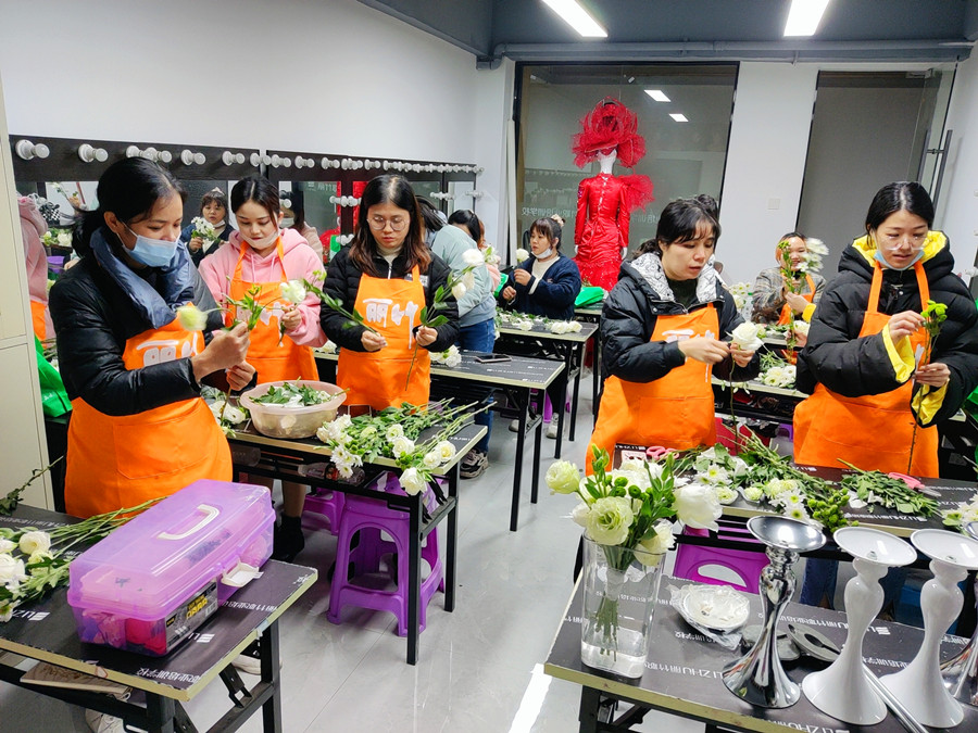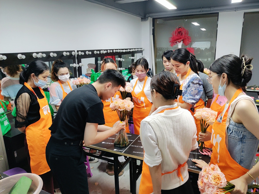 學(xué)員動(dòng)手實(shí)操進(jìn)行插花練習(xí)