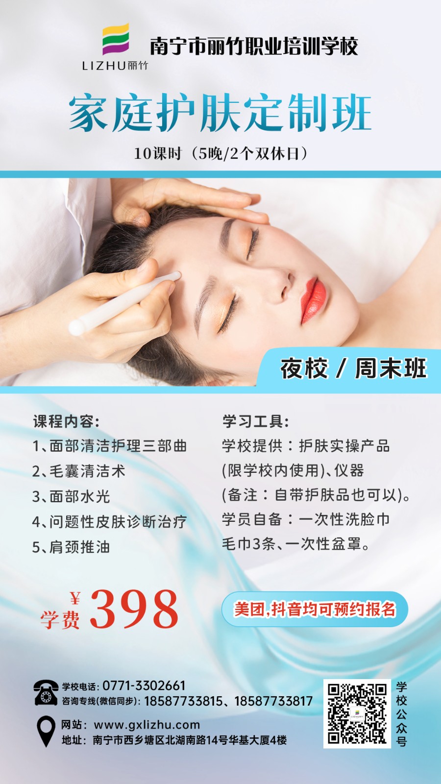 南寧美容護(hù)膚培訓(xùn)學(xué)校(夜班/周末班):家庭護(hù)膚定制班