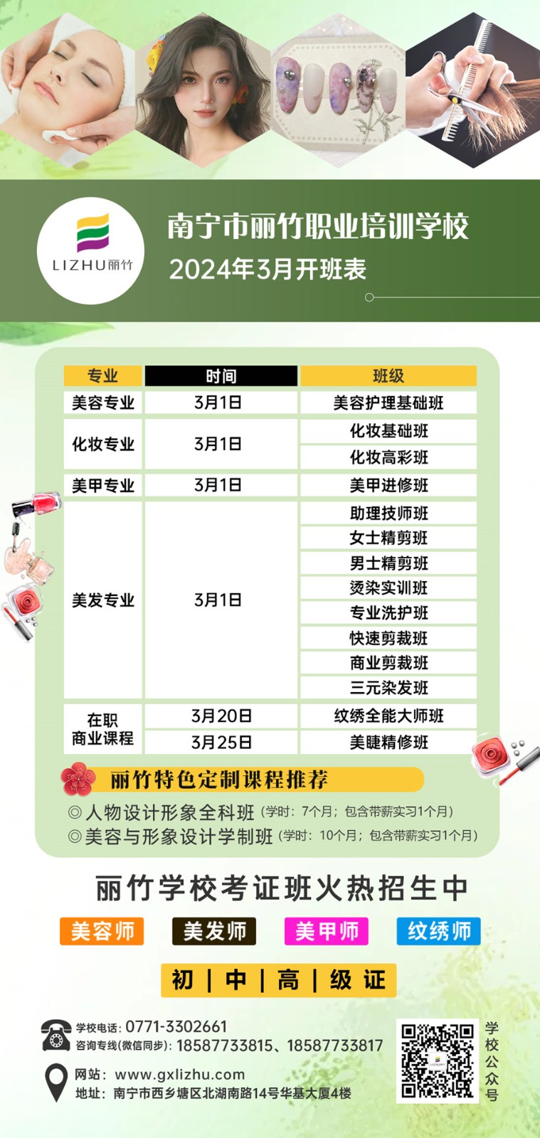 如果你想學習美業(yè)技術(shù),想在廣西零基礎(chǔ)學美容美發(fā)?想知道廣西化妝美甲培訓在哪里?廣西哪里學紋繡專業(yè)?同時還想到廣西美睫學校去學美睫?那么,請你千萬不要錯過廣西美業(yè)專業(yè)職業(yè)學校-麗竹學校3月的開班安排了啦!早學早就業(yè),就能早點實現(xiàn)人生目標。