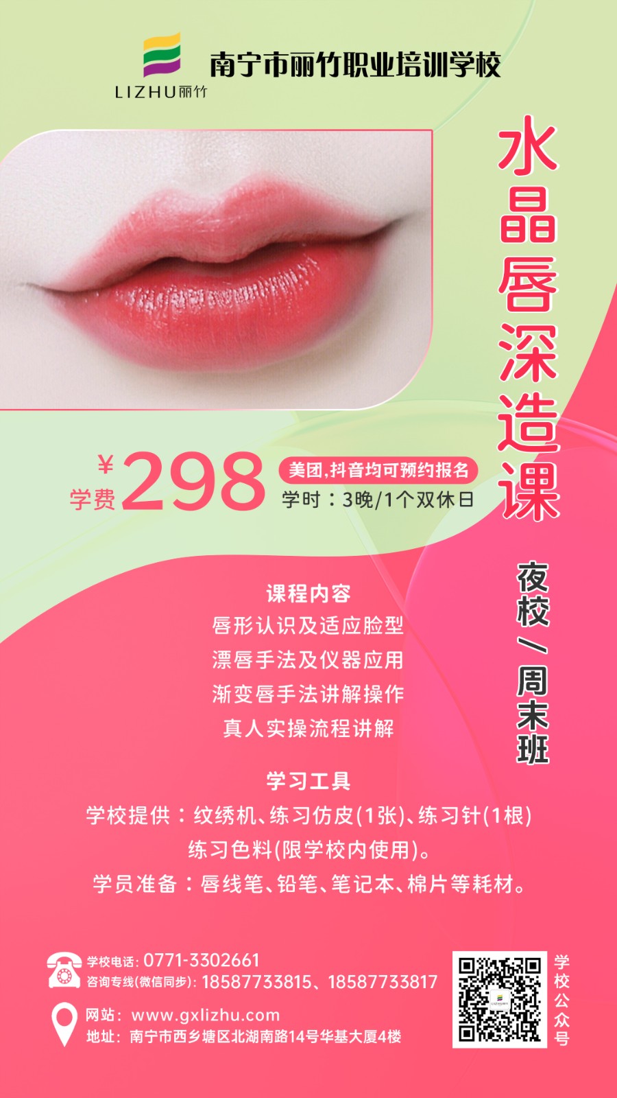 廣西彩妝造型學(xué)校、廣西美甲培訓(xùn)、廣西美容短期班、廣西培訓(xùn)紋唇、廣西紋繡眉眼唇學(xué)習(xí)分享:麗竹學(xué)校特色課程(夜校/周末班)熱門火爆技能課程重磅來襲啦!課程涵蓋化妝,美甲,美容,紋繡等技能,感興趣的小伙伴趕緊關(guān)注麗竹學(xué)校了解更多課程詳情和現(xiàn)在正在進(jìn)行的優(yōu)惠活動(dòng)詳情。